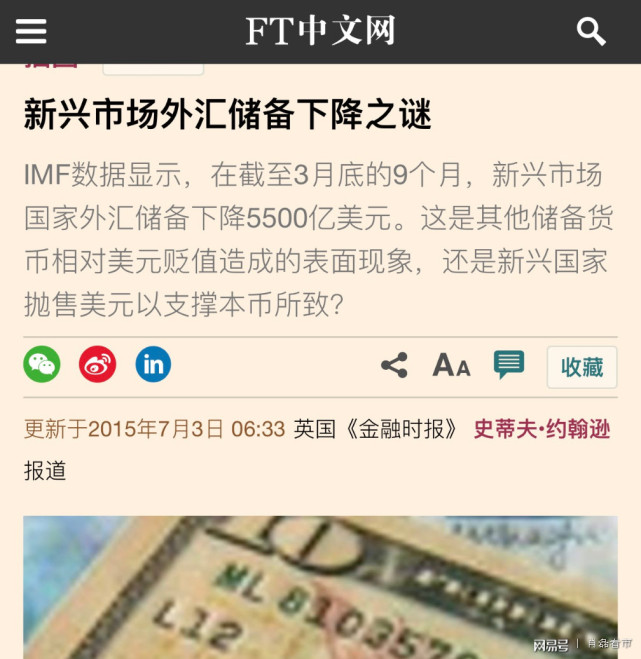 按照国际货币基金组织(IMF)等的数据,仅2014年6月至2015年3月,新兴市场国家的外汇储备就下降了5500亿美元。中国就更加明显了,中国目前的外汇储备的总量,比最高的时候,下降了接近1万亿美元。