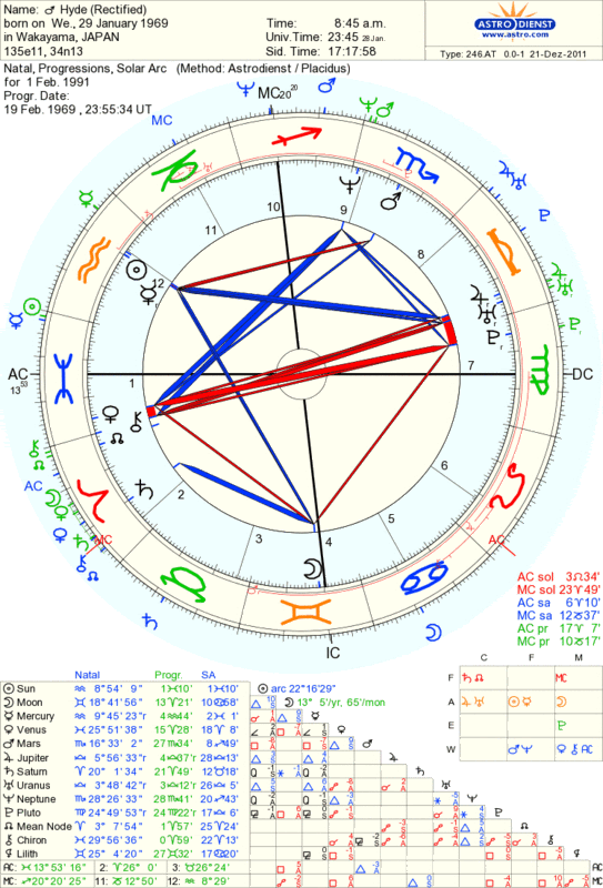 我感觉通过小四条的出生日期矫正出来的hyde生时,由于测试出众多的太阳弧与推进合轴相位,已经非常精确了。不过为了保险起见,我们还是要再用拉团结成的时间来测试一下。排出1991年2月的推进来看,似乎并没有很多重大相位。再排出太阳弧来看,有一个十分重大的合轴相位出现了,那就是太阳弧海王星与本命MC的合相(容许度为0!)。对比盘子>在此<。还有什么比这更能说明艺术上(海王星)的追求和事业机会(MC)了呢!