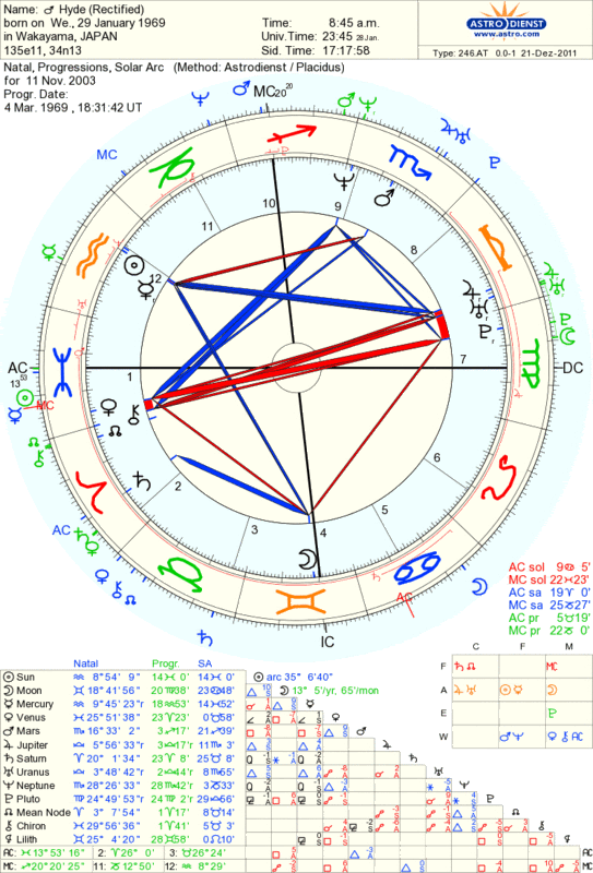 先来看小四条出生的日子,因为这个日期最明确,重要性也没有争议。打开2003年11月11日的推进与8点30盘子来对比可以发现,还是有一些重要推进的,比如海王星与本命太阳合相,冥王星刚过了MC。除此以外,推进土星(巨蟹13度)刚进入五宫没多久(五宫头为巨蟹9度)。看似有那么一些主题,不过刚也说了,推进太缓慢,不能用来推算精确的生时。我们打开太阳弧来看一看。我立刻注意到的是太阳与火星的这组四分相(8度的入相位)。在与8点30盘子的对比图中这一组太阳弧相位刚好分别过了上升点和MC大约6度(上升点和MC也是容许度为8度的四分相),这不是太巧了吗?于是我决定把上升点从双鱼8度调整到双鱼14度左右,这样一来太阳弧太阳与火星的四分相就正好分别精确地合了本命盘上升点与MC。矫正得出的时间为8点45分,上升点为双鱼13度53分,MC为射手20度20分。此时太阳弧与本命的对比盘>在此<(用Astrodienst排太阳弧只能把次限也一起排出,次限太阳就是太阳弧太阳)。再反过来用推进一看,这时的推进土星刚刚好跨过五宫头进入五宫(容许度为1度),而推进火星与上升点合相,推进冥王星与MC合相(容许度为2度)。至此我已经觉得,这个时间有可能是相当精确的。不但因为太阳弧和推进都有精准的合轴相位,而且我们可以用这些相位来推测一下儿子出生对于hyde的意义。上一篇我也提到与他盘子中强大梦幻与三王星都有联系的金星相比,hyde的火星看起来要弱得多。其实金星与火星对每个人(无论性别)来说都同等重要,金星代表的是每个人人格中的女性面向,而火星则代表人格中的男性面向。不过由于社会对性别的一些固有观念,很有可能女人更容易认同并发展自己性格中的女性面向,男人反之。hyde作为一个男人,要平衡好自身这股十分不均衡的金火能量并不容易。hyde生得十分清秀,小时候母亲一度把他当做女儿来养,想必对他造成过相当大的性别困惑。长大成为艺术家后,hyde也一直以非常“美丽”的形象出现。对于一个男人来说,在这种金星能量已经发挥到极致的情况下,如何开发火星能量证明自己呢?我想最明显的答案就是生孩子了。太阳弧太阳和火星分别与本命上升与MC合轴,有一种男性力量终于得到证明的意思。而此时推进土星正好进入五宫,可以表示一种创造力的落实。推进火星合上升,推进冥王星合天顶,更强化了男性能量的主题,难怪他生的是一个男孩子(当时的推进就是小四条的本命盘)。hyde通过创造出一个男性生命来活出了火星所代表的男性面向。有意思的是,小四条出生于11月11日(太阳天蝎18度),他的太阳与hyde的火星(天蝎16度)也形成了合相。我觉得,儿子的出生对hyde来说有重大的自我发展与完善方面的意义,在儿子身上hyde可以找到久违的对男性面向的认同,他终于得以平衡自身的金火能量。于是我也有理由相信,这个世界上对于hyde最重要的两样东西,一样是艺术,另一样就是儿子。他一定是一个非常好的父亲。