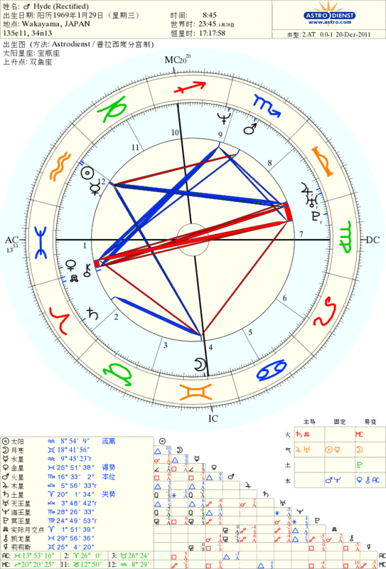 生时矫正在占星学里一向非常tricky。Lois Rodden的Birth Data分级制直接把矫正过的生时(rectified birth time)划为C级(Caution, data not validated),仅仅比最低等级的DD(dirty data)好一档。所以,就算我下面的论据显得再有道理,最多不过得出一个C级data而已。我当然衷心期待有朝一日hyde桑可以公布他的准确生时,不过在此之前,不妨先用我推导的这个C级data测试一下。