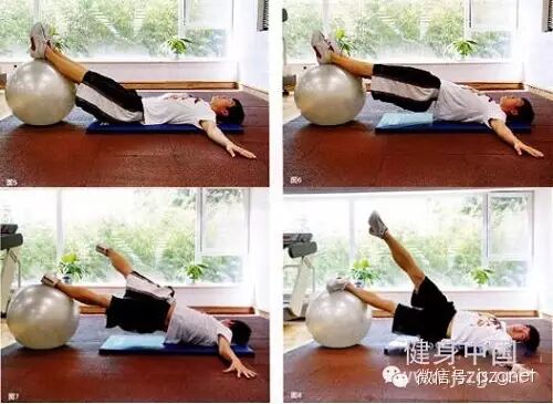 2、单腿撑于平衡球上的旋髋练习,动作方法:平躺垫上,一腿置于瑞士球上,抬起上体呈一直线,双臂伸展置于地面上;另一腿绕身体做内收外展的旋髋练习;保持均匀的呼吸。