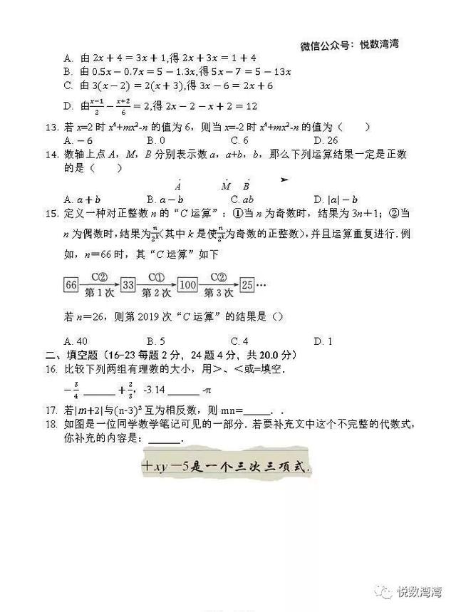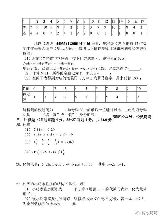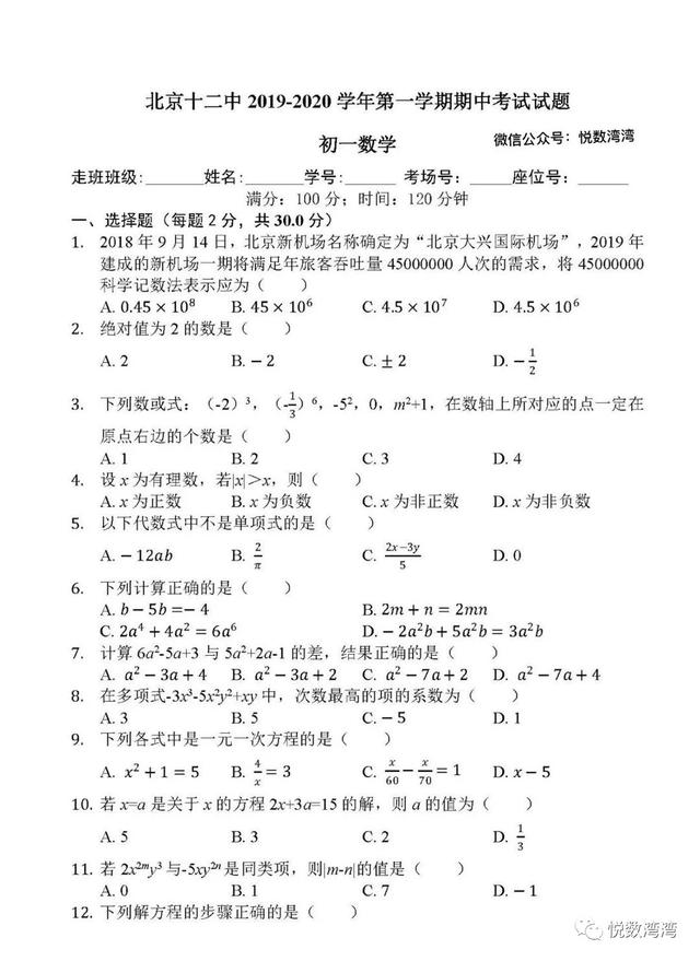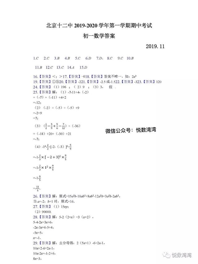 2019~2020学年北京市十二中初一七年级(上册)期中数学试卷《附带标准》