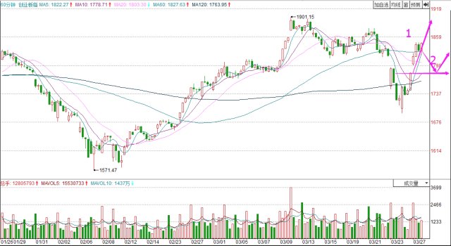 创业板这个位置还是有悬念的,继续反弹的概率还是比较大的,但会存在两种可能,第一种:周三和周四延续反弹走势直接向上反弹并攻下1900点关口,第二种:开始向下出现调整回踩缺口1780点附近,然后再进行上攻,当然如果回踩就需要注意,如果跌破了缺口支撑,短期就会转弱了。