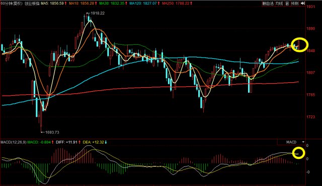 创业板这一波60分钟级别的反弹终于有向上的动能,出现的时间点也是在周四尾盘,这一次反弹契机是上证和创业板两大指数在周四尾盘形成一次共振,从均线和MACD指标来看这里有望形成一次向上加速的走势,注意1880点附近压力位,这是短期压力。