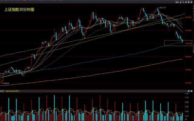 第二:从技术走势来看,上证指数小周期也进入了下跌趋势当中,这个30分钟是很明显的一个下跌通道之中,走了一波ABC浪调整结构,现在是处于C浪调整。这个C浪调整何时才能止跌,可以关注一下3500点这个整数关口,如果这个位置能够企稳,大盘还有反弹的机会,如果挺不住还会继续向下探底,如果说短期资金离场之后没有快速流入,那不排除指数会调整到3414点附近这个缺口的位置,技术逻辑推理是存在这个可能的。所以对于指数还要保持防守操作策略。
