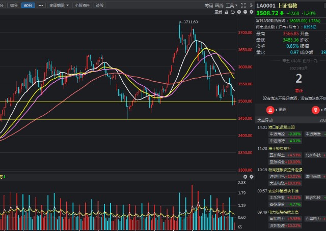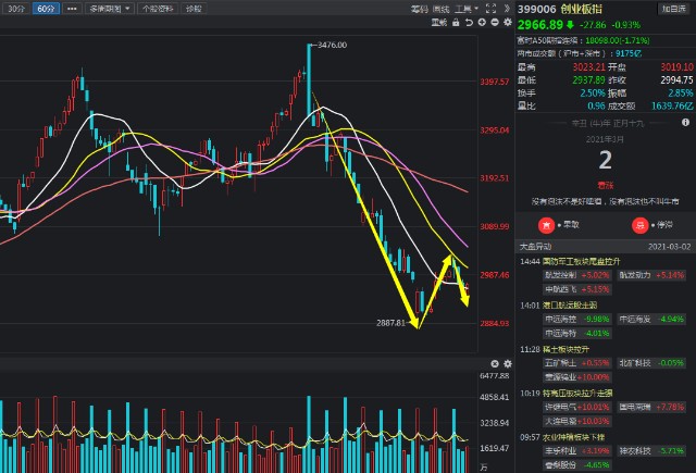 再来看一下创业板60分钟级别走势图,上证指数60分钟是创出新低的,但是创业板这一波并没有创出新低,而是试图在2959点这个位置形成止跌的动作,今天也是创业板在分时级别形成了一个双底率先开始反弹的,能够率先反弹有一半的功劳是因为宁德时代出现了一颗阳线的反弹,一方面宁德时代流通市值非常大带动作用明显,其他创业板个股才开始出现跟涨的动作,那宁德时代还能涨多久,近期我们的文章谈到了这种形态,连续下跌破位之后出现的反抽,短期就要看压力位363-379元这个压力区域能不能过去,这是短期需要关注的。