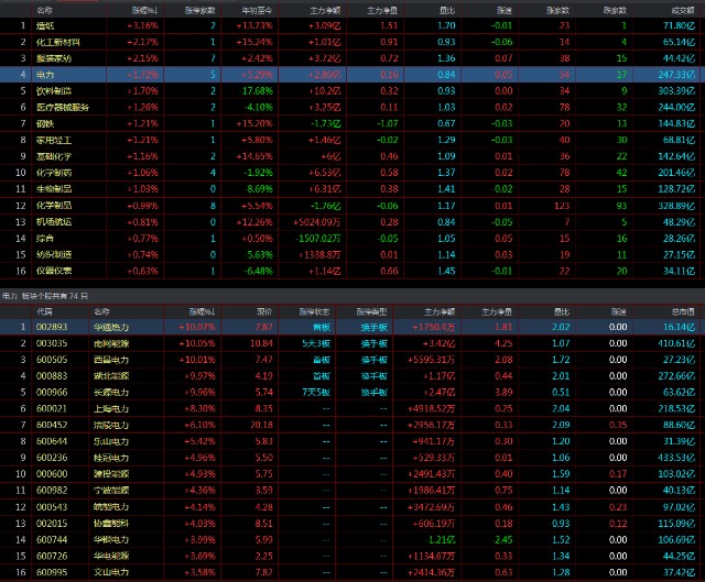 说一下板块的节奏,今天从盘面上来看是没有出现明显的热点了,连续拉升的板块近期也没有出现,其实有一条主线就是低位权重板块的轮动节奏,有色、煤炭、钢铁、化工、电力等都出现了轮番上攻的节奏,也包括机场航运、旅游等是估值修复、也是一个低位权重轮动的状态,未来板块的状态会是一线金融银行和券商作为底牌,而其他低位权重要进行轮动反弹依靠这个力量来推动指数震荡上扬,这和上证指数月线图慢牛行情的判断是一致的。