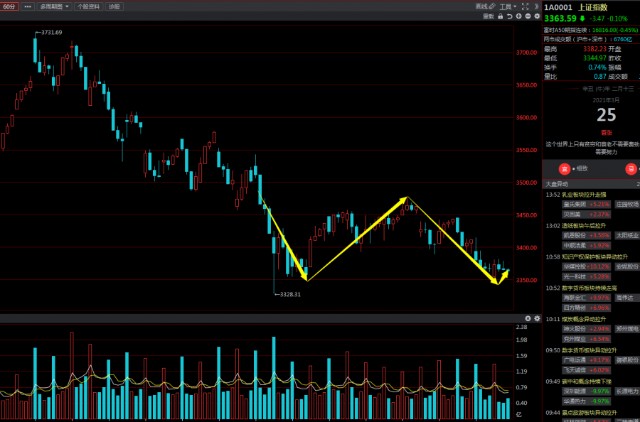 大盘短期走势有两种可能,第一种是走ABC浪调整结构,那现在就是处于C浪调整的阶段,按这个逻辑走指数是会跌破前期低点3328点的。另一种走势回踩确认一下3328点附近的位置,在这里构筑双底结构然后起反弹。而今天大盘在3328点上方,60分钟又做了一个小的止跌信号,把短期的悬念留到了周五了,到底大盘如何选择,如果说这里想要做双底那就必须要在周五拉出一颗阳线,并且这颗阳线不能太弱,至少要站上3380点这个60分钟级别的底部才有成型的可能,所以今天和明天上午先不要上手,等到底部成型才是指数小周期的位置.