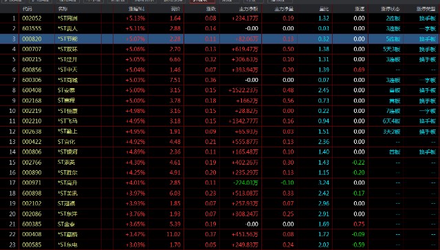 第一:我昨天讲到了一个盘口的信号,如果垃圾股持续走强对于大盘是非常不利的,说明短期资金开始失去了主攻的方向,看看这些ST个股的表现,ST节能5连板,ST恒康7连板,ST飞马6天4板这些个股走势太强了,但是他们的走强对于指数来讲没有一点好处,并且会起到反作用。