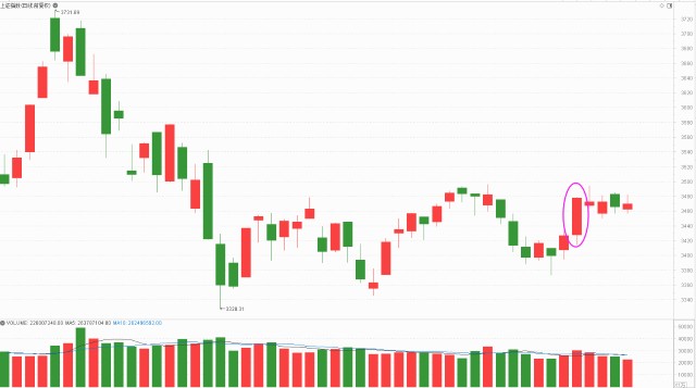 把本周的行情梳理一下,周线这颗K线是收出了一颗阳线,这一颗周阳线就是靠周一的中阳线,后面跟了4颗小K线(小阳+小阴线)也就是反弹一天震荡了四天,很关键的压力位3500点还没有完成有效突破,3500-3600点这个筹码套牢盘区域还是压力位比较大,暂时还没有能力突破这个区域,甚至连挑战的勇气都没有。很重要一个原因就是成交量不够,我们看本周的5颗K线成交量是一个持续缩量的状态,周一上证指数成交金额是3685亿,后面都是持续缩量,这也是属于量价的背离,反弹没有量能一定是走不远的,想要突破3500-3600压力区域,上证单日成交金额应该保持在4000亿以上才是可以的。