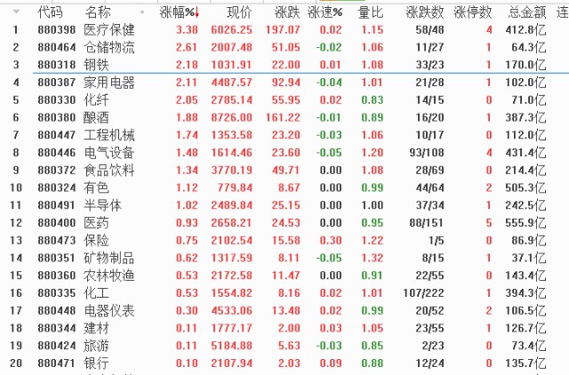 板块机会在哪?从本周一开始市场出现了很多的热点,并且切换的速度是比较快的,包括有色、钢铁、煤炭等板块都有所表现,反弹仅仅维持1-2个交易日就会走软,说明热点比较散乱。但其实也是暗藏一条主线那就是资金选择进行防御操作策略,包括白酒、医药这就是最典型的防御板块,主流资金现在也不敢进攻了,白酒板块整体位置比较高,所以重点关注一下医药板块。还有一个防御板块就是银行,银行是多方主力资金的战略板块,大盘真的遇到危险需要抬升指数的时候还是需要银行来挺指数的,能不能把指数挺住不好讲,但是大概率是要动银行的,所以下一个阶段板块策略就是银行+医药的组合。