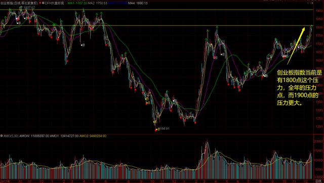 创业板指数目前压力刚好在1800点,而1900点的压力更大。这地方没有足够的大成交量冲击,估计是上不去。