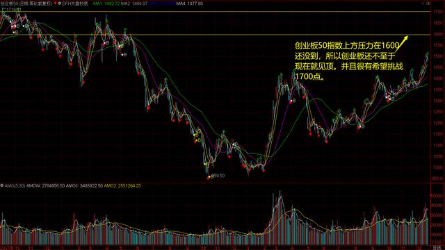 创业板50指数还没有到压力位1600点,应该还有向上的冲击动力,1700点这里的压力才可能比较大的压力。