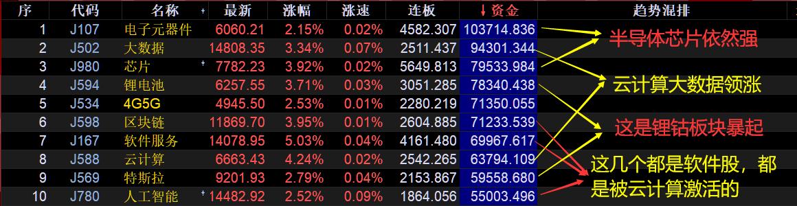 2、云计算。大数据和云计算重新入榜,且排名上升,这是今天领导核心科技股的关键板块,大面积崛起,而且今天更加偏重软件方向。所以也带动了软件板块多个细分题材。云计算是5G应用大方向,持续强势,重点板块之一。