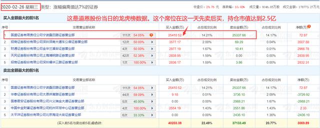 下图是市场上的一个游资席位国盛证券有限责任公司宁波桑田路证券营业部在2月26日的龙虎榜信息,这个席位当天买入上市公司口罩概念股002838道恩股份2.5亿。根据A股的交易规则,当天买不能当天卖,所以这个席位在当天一定是先卖后买,所以确定最终2月26日持仓2.5亿道恩股份。