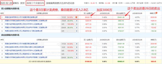 这是桑田路第二笔买入道恩股份,3天后,2月28日道恩股份再次公告龙虎榜数据,桑田路席位已经累计买入道恩股份达到2.8亿之多,而3天内包括2月26日,累计卖出才多了100万。说明在这3天里面,这个席位没有出货这个股票。