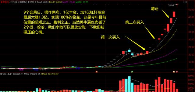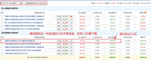 3月4日的两个龙虎榜数据,我们可以看出在3月4日当天他卖出了3.2亿,但这不是全部,因为3天内累计卖出了4.58亿,其中一天他买了6000万,我估计还是类似2月26日那样,先卖出了一部分,然后又买回了6000万,这样实际净卖出4亿不到。从2月26日的2.5亿,到2月28日加仓3000万到2.8亿,最后3月4日卖出6个交易日,股价涨幅达到48%。桑田路净卖出4亿,大概赚了1.2亿。大概是42%,加上第一笔净赚的6000多万。两笔交易合计宁波桑田路在这个口罩股上面用1亿资金,加杠杆,总计10个交易日,累计盈利1.8亿。大赚180%。这应该是超短界里面今年的盈利之王。