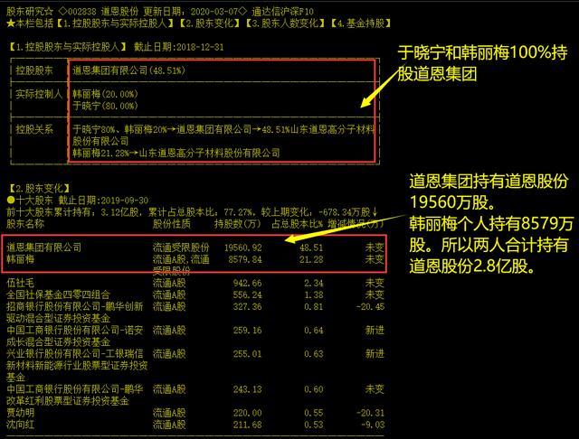 道恩股份股价从1月23日的11.46元,因为口罩概念爆发,股价一路上涨,截止到3月6日股价还是涨停的,价格已经涨到了53.64元。25个交易日累计涨幅368%。上市公司股东一致行动人韩立梅,于晓宁。因为合计持股道恩股份上市公司70%的股份2.8亿股。其两人合计持有的股票市值从1月23日的32亿,到3月6日已经涨到了150亿。预计下周高开,其两人妥妥的已经拿下120亿财富增值。短短的25个交易日两人合计爆赚120亿,我觉得爆赚这个词已经无法形容他们的财富获利程度,应该是核爆级的。