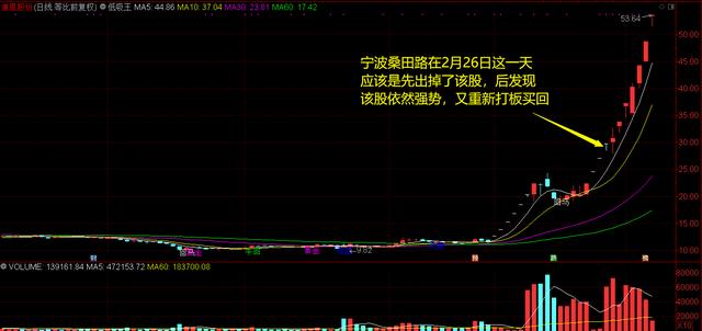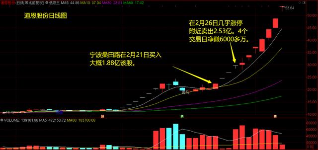 2月26日当天先卖出了2.5亿,可以明确的说,桑田路在这之前就已经持有这个股票了,观察道恩股份的价格走势,你就会发现,这个股票4连板,其中有两天是一字板,它肯定没有卖出,也无法买进,唯一能买进的时间是2月21日或者之前,因为游资席位都是打板为主,所以我分析宁波桑田路是在2月21日这一天买进,那么到2月26日,一共4个交易日,他至少是赚了33%。2月26日卖出的2.5亿多,推算本金是1.88亿。4个交易日净赚6000多万。但这只是第一笔盈利。