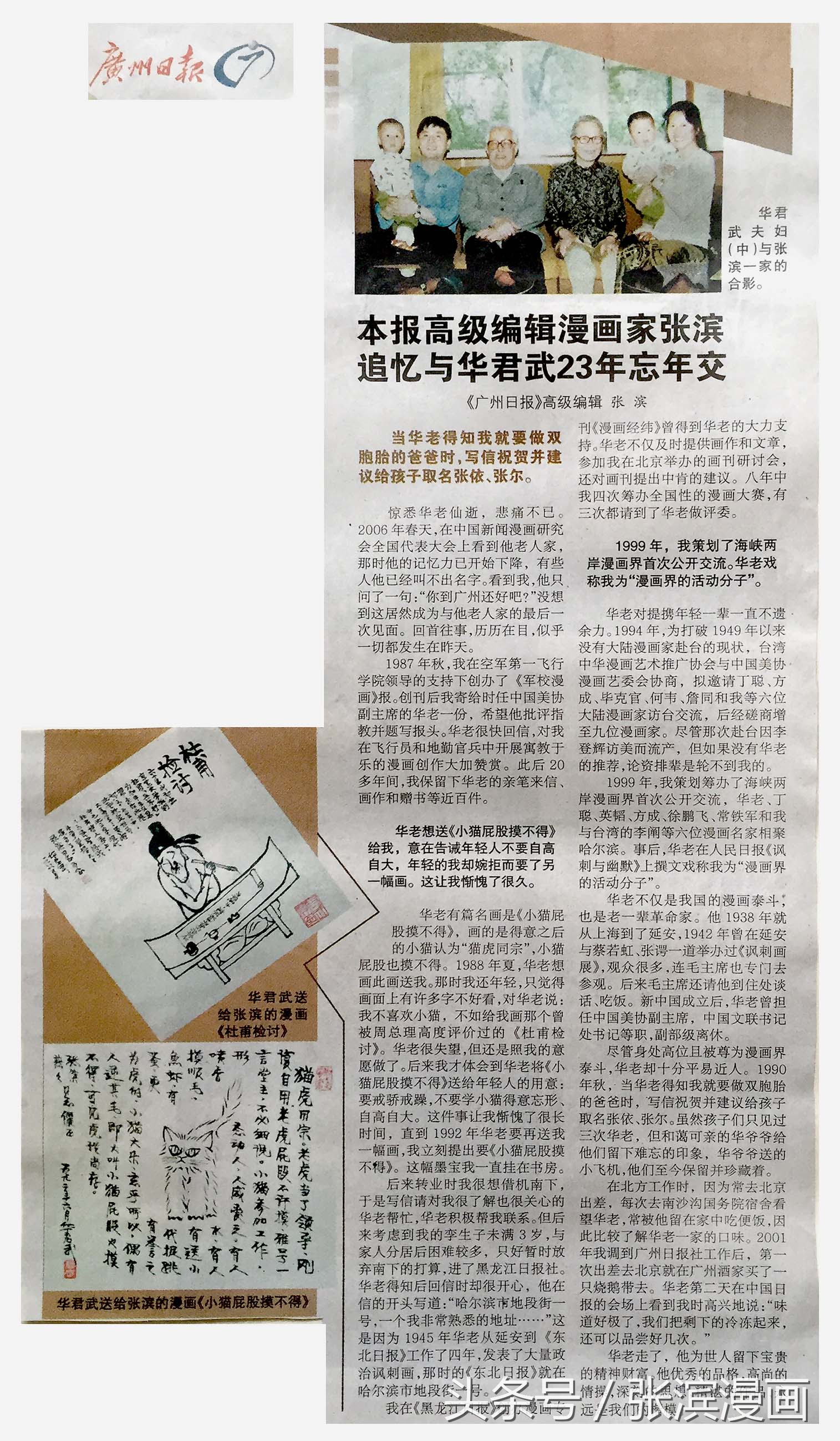 2010年华老去世,《广州日报》以整版篇幅介绍华老革命生涯及艺术成就,同时刊出了我的缅怀文章。华老为世人留下宝贵的精神财富,他的关心和教诲使我在新闻漫画领域有所建树。他优秀的品格,高尚的情操,深刻的思想,精湛的作品,永远是我们的楷模。
