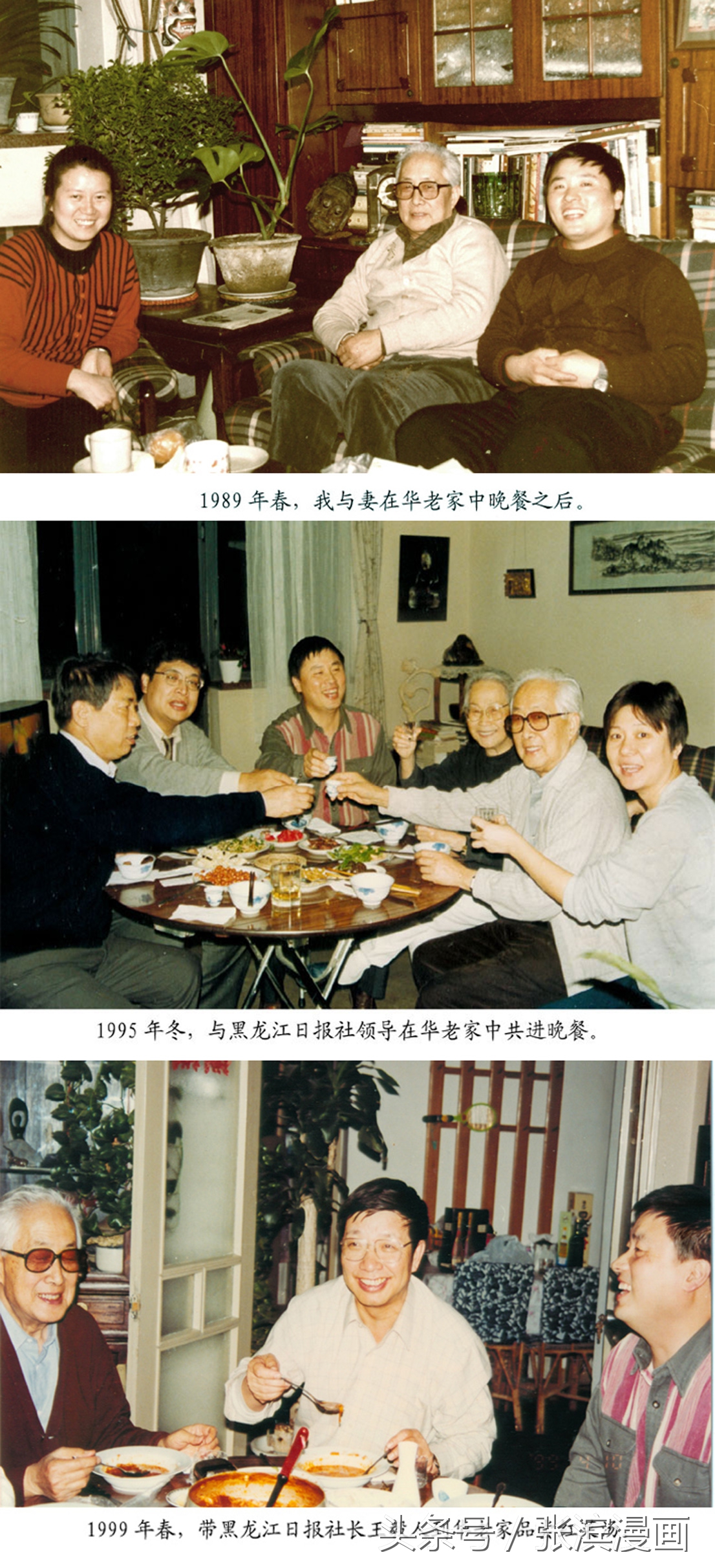 华老副部级离休。尽管如此,他十分平易近人。因为常去北京出差,我不仅分别与王复羊老师、漫画家刘壅、黎青在华老家中吃过饭;黑龙江日报的三任社长,贾世祥、王毅人、杨殿军都分别与我同在华老家中吃过饭。而我自己则多次被华老留在家中吃便饭。最巧的是1999年深秋,我去北京开会,与华老通话后他说晚上过来吃饭。本不想在华老面前提到我是来领奖,但那晚是边看新闻联播边吃,结果播出中国新闻奖颁奖大会时,华老夫人宋琦发现了捧着奖杯的我。华老笑着说,得奖是好事,小猫学会谦虚了嘛!