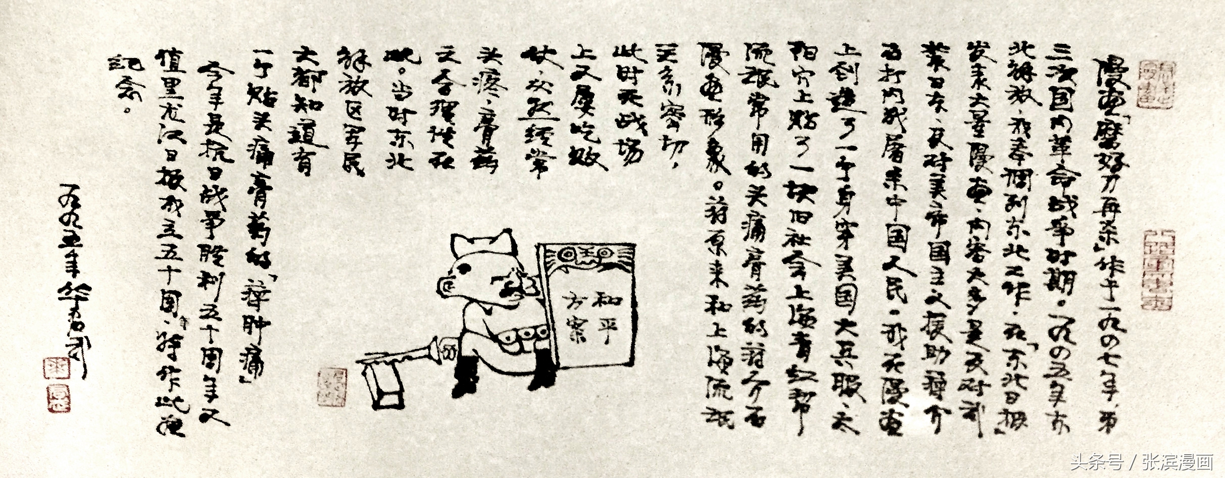 华老不仅是我国的漫画泰斗,还是中国新闻漫画的先驱。他1938年从上海到了延安,1942年曾在延安与蔡若虹、张谔一道举办过《讽刺画展》。1945年到《东北日报》,在这里工作时画出了名作《磨好刀再杀》(下图是我1995年请华老为黑龙江日报所作,他特意增加了关于这幅作品在当时的新闻性、评议性和艺术性的文字,而且说这是他所有漫画中写字最多的一幅)等一大批优秀作品。解放后,华老先在人民日报任文艺部主任,此间发表过许多很有新闻性的国际漫画,后来才到中国美协工作。