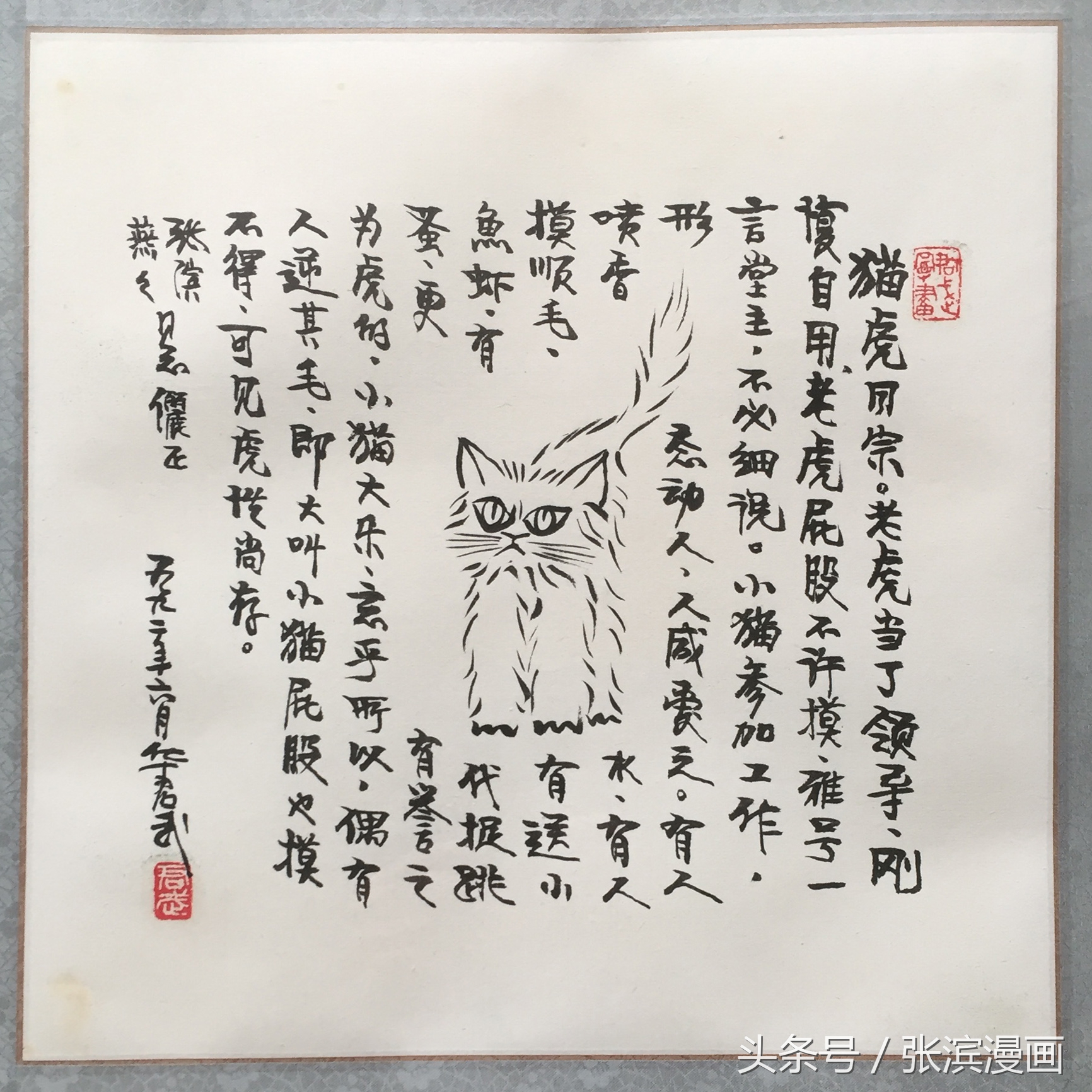 1988年夏,华老主动要画一幅《小猫》送给我,但年轻的我说:更喜欢《杜甫检讨》,因为这幅作品曾被周恩来总理赞扬过,于是乎,喜得墨宝。但此后华老开玩笑说我不喜欢他的《小猫》,因为我也是小猫屁股摸不得。1992年,当华老再次要送画给我时,我立刻请他赐画《小猫》。另三幅墨宝是华老自己认为画得很好主动送给我的。