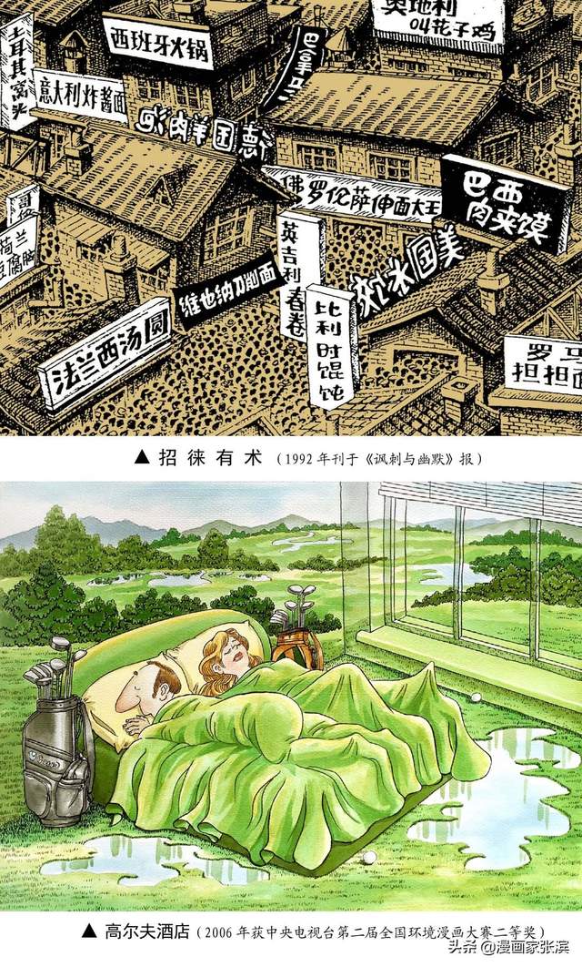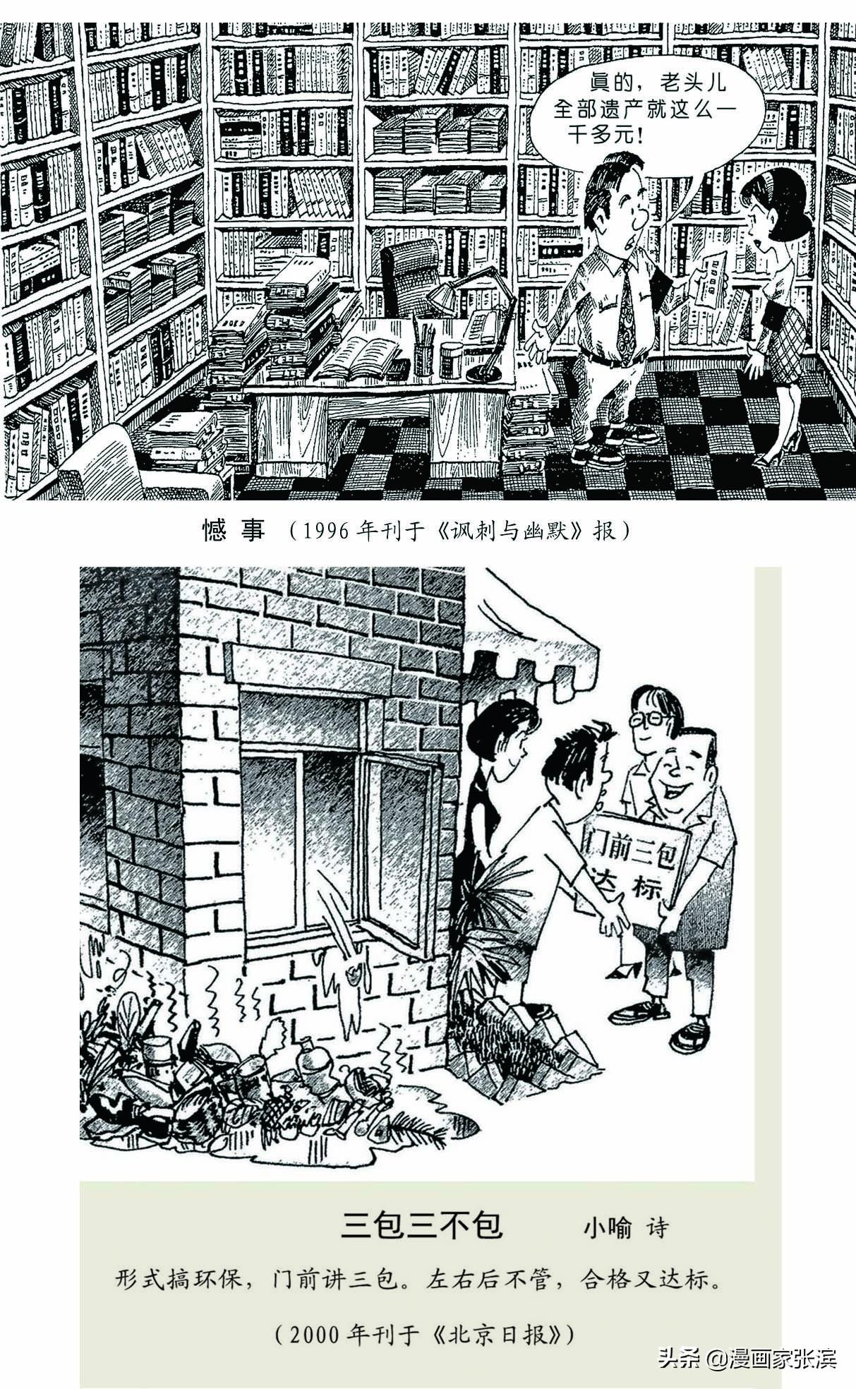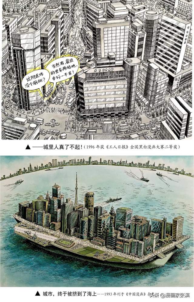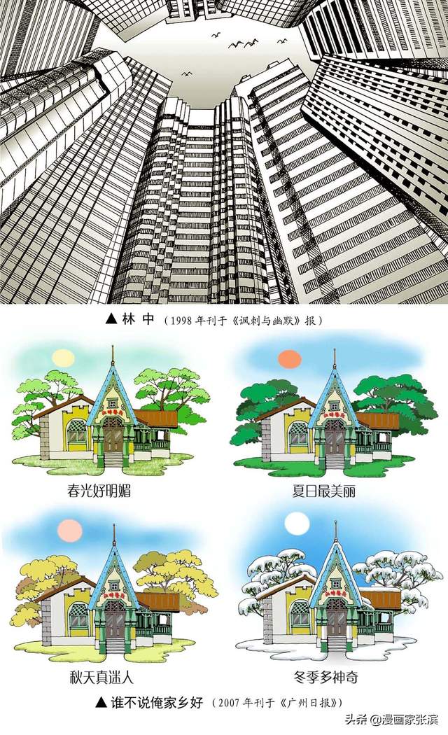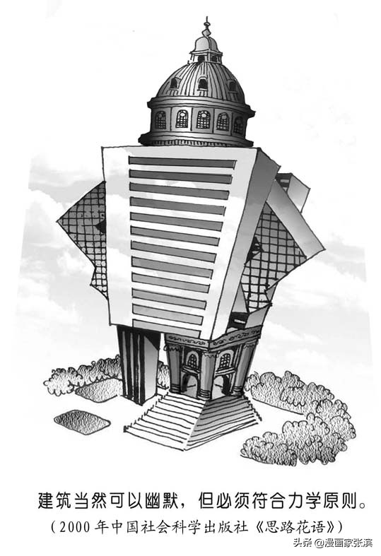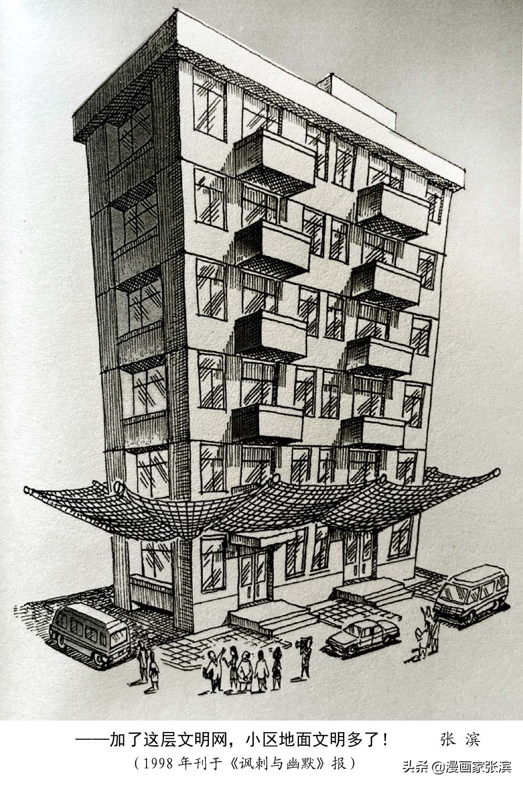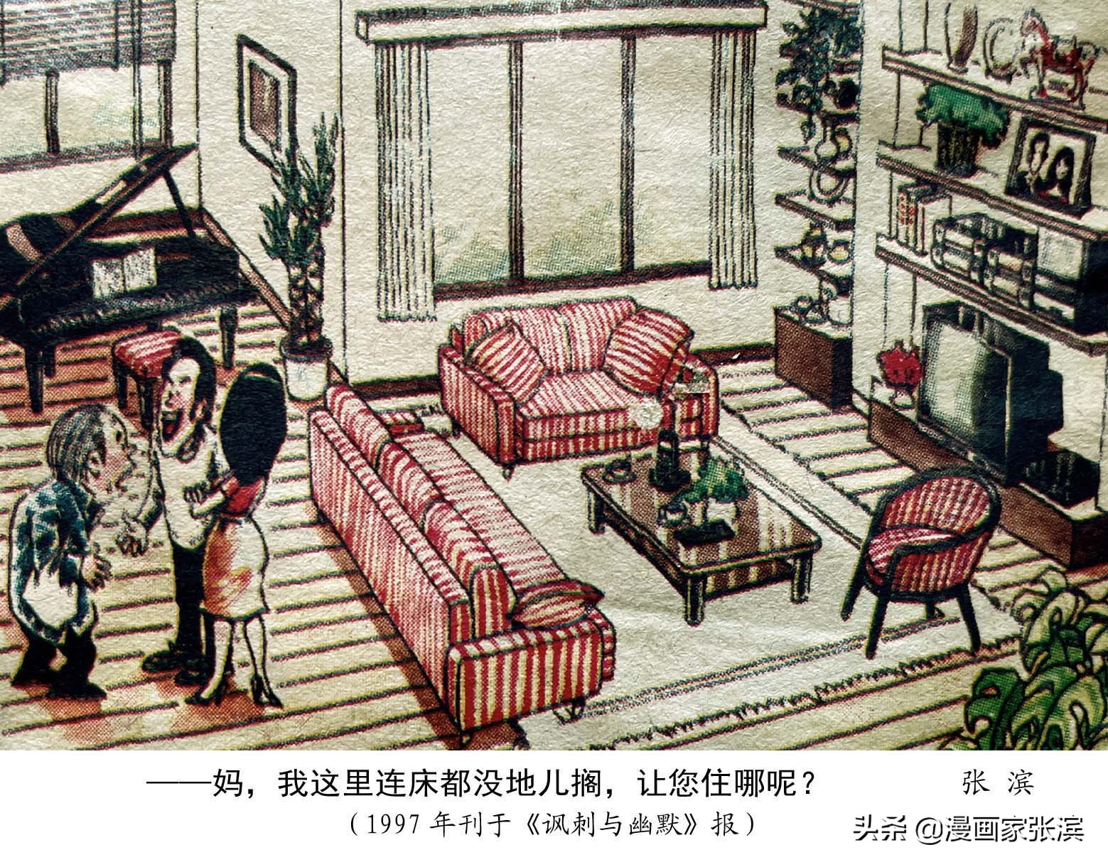 前文发出后,收到夸赞的私信不少,多谢好友们的关注!其实我不仅喜欢画房子,在作品中喜欢刻画室内场景和家私也是与多数传统漫画家的区别。中国漫画泰斗华君武先生在上世纪八十年代末时说“张滨的漫画已形成自己的风格”,这里一是说人物造型,二是说我擅长画大场面、建筑物、室内场景等。