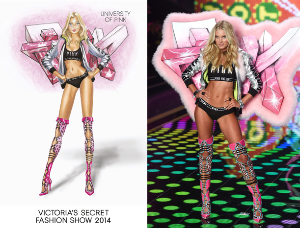 美国的舞台服装设计师兼艺术家 Jeff Fender 为此次大秀制作了 10 套手绘服装。其中最耀眼最夸张的就是 Elsa Hosk 为粉红大学主题开场那款粉红翅膀。Jeff Fender 及其团队每天需要花费最少 8 小时来进行手绘,其中还未包括图案设计,这样才能赶上大秀彩排时交出成品。在 CBS 播放的节目中也会讲到他的创作故事,可以一同关注。