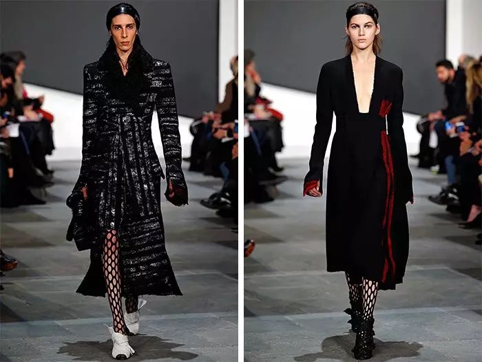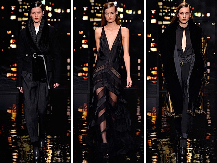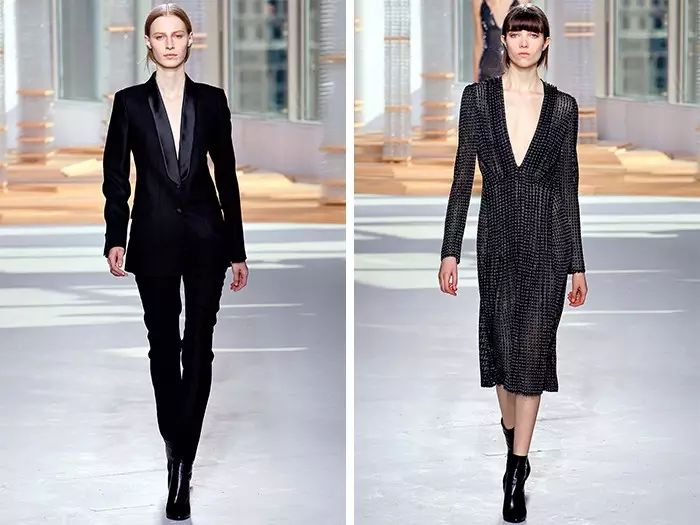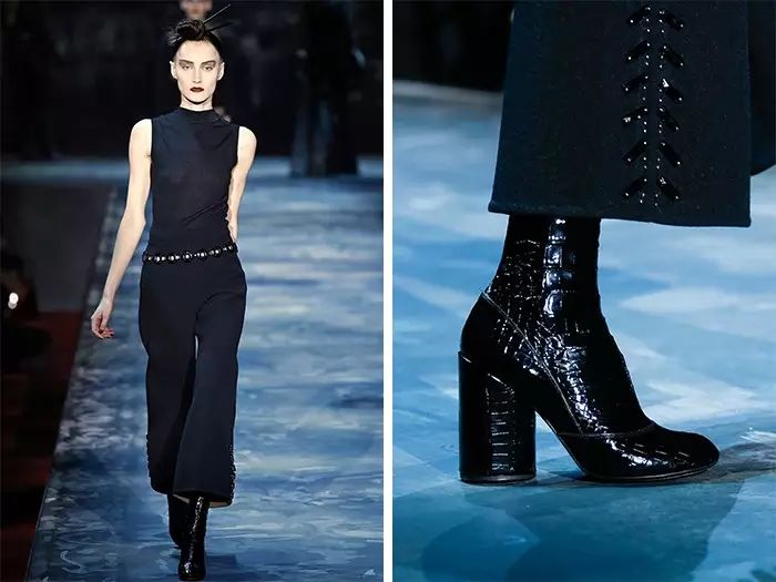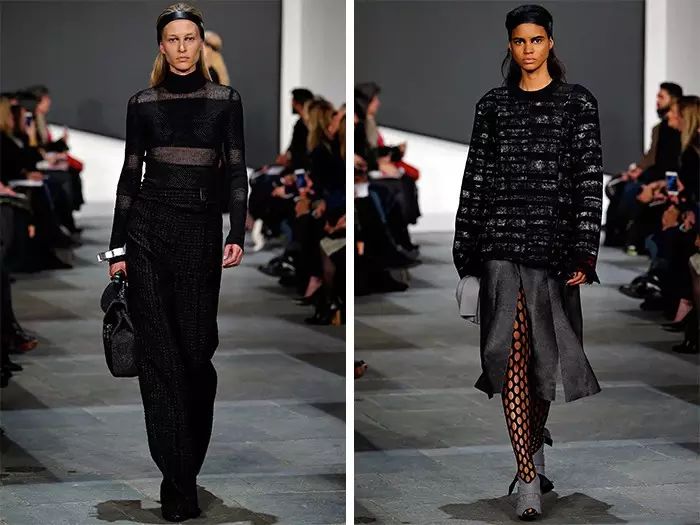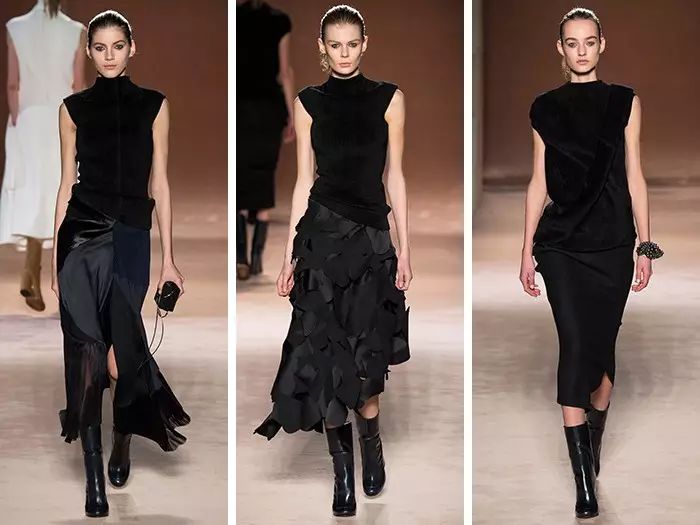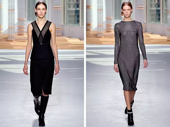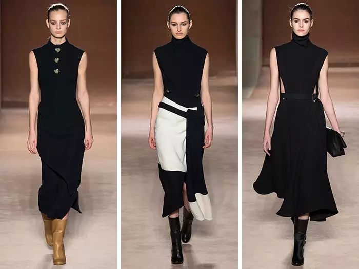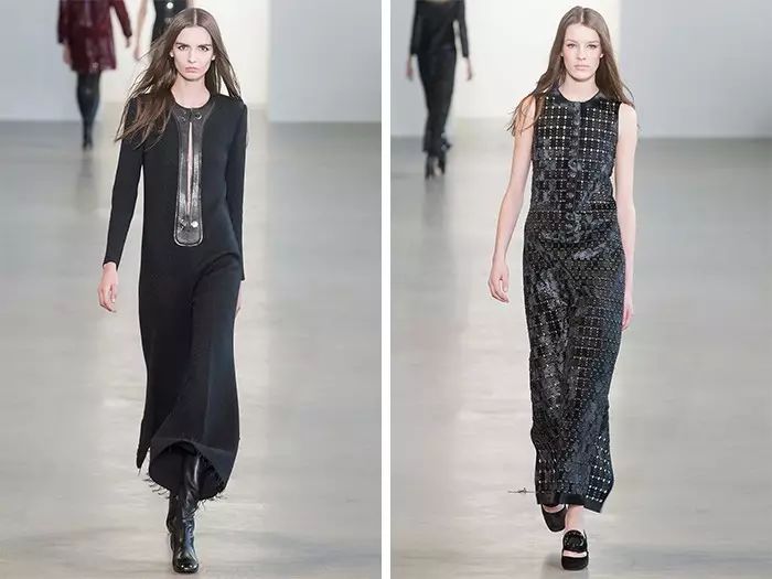 ▲Calvin Klein Collection 的“黑”中有过膝的紧身长靴、有连身且宽大的 swingy 裙裤,还有 70 年代的 A 字裙。超长的连身裙则是现代简约式减法的产物。