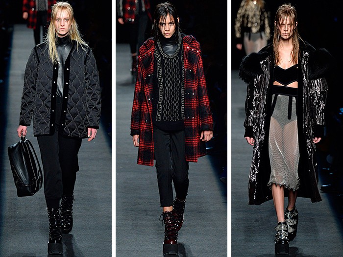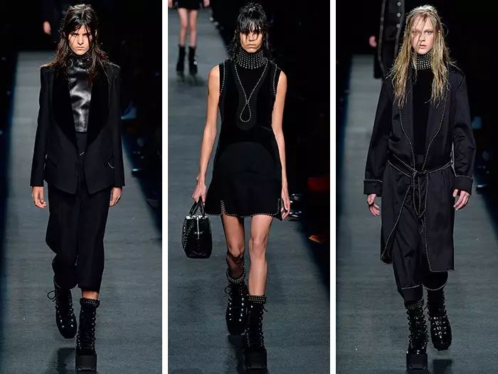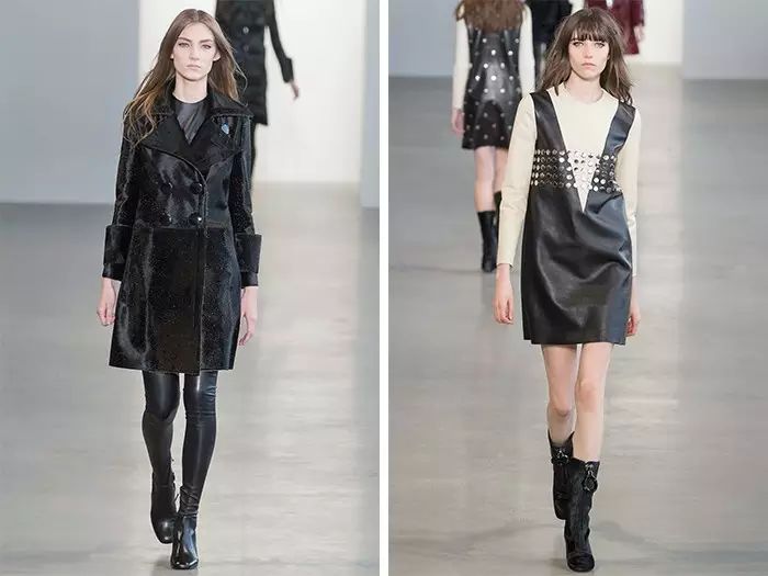 ▲有了 Jason Wu 的加入,BOSS 的女装确实有了不少长进。尽管仍是女强人专用,但秋冬女装所表达的柔美丝毫不逊色春夏季。适当的裸露和凸显腰线的剪裁应有尽有,金属感连衣裙让女性在钢筋水泥间拥有了力量与性感两种能量。▲当大家都在猜测 Alexander Wang 会做出什么街头运动服饰时,他却转向了皮革背心、铆钉鞋、丝绸睡衣和棉夹克,重要的是,它们并没有因为是黑色便粗略以待,王大仁用滚珠代替衍缝、作为花边点缀在黑色之上,凸显出精良的剪裁。