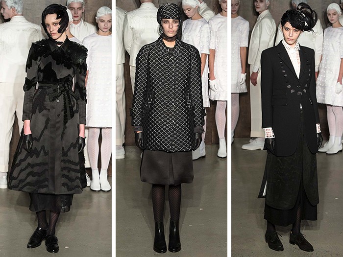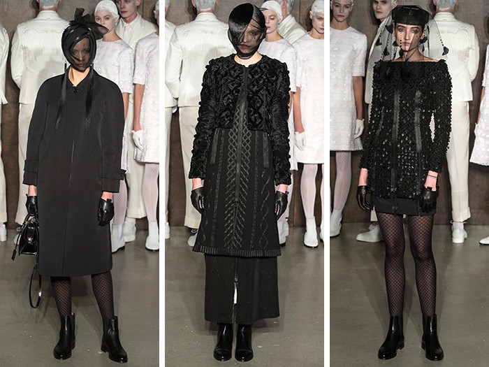 ▲说实话,Thom Browne 不属于纽约,他的怪诞和戏谑应该是巴黎的。不按常理出牌的设计营造着戏剧般的诡异气氛,黑色的全套系呼应着之前的秋冬男装。那些“为爱牺牲的阴魂”能够拥有这么多变化的葬礼服,也算是死得其所了。