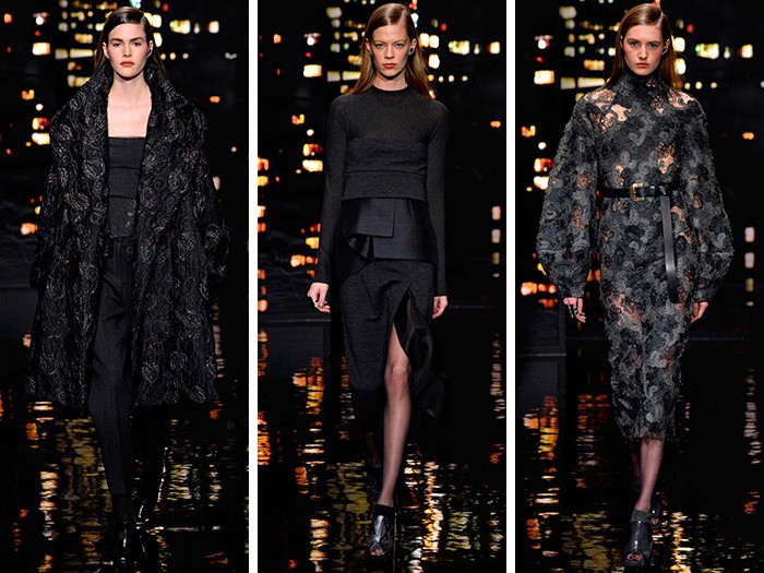 ▲身为 CFDA 主席,Donna Karan 应该是最有权力将纽约当做背景舞台的人了,但璀璨的城市天际线反而将 T 台上的黑色系列显得更加模糊,幸好腰带解除了夜晚的魔咒。黑色玫瑰、和服元素、透视蕾丝纷纷展示出纽约女性的国际化气质与流动的线条美。