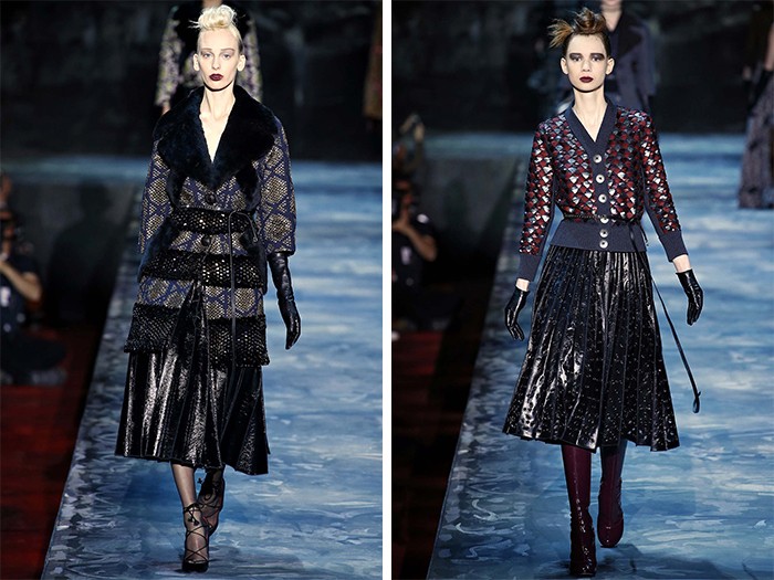 ▲Marc Jacobs 的 2015 秋冬仿佛又回到当年的 Louis Vuitton,尽管他声称暗黑色的哥特妆容和浮华背景来自 Diana Vreeland 客厅里的 Jeremiah Goodman 油画。但在蛇纹大衣及百褶裙的质感上,Jacobs 已经做到了最好。