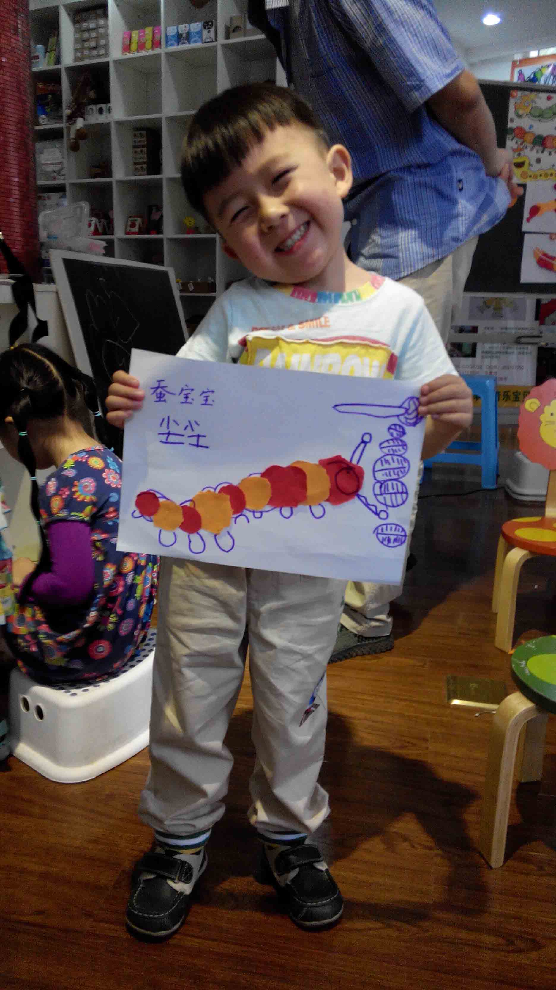 另外,小满蚕宝宝体验课,老师先通过音乐和视频让孩子们认识蚕宝宝的美丽和动态,进而巧用多个圆、两种不同的颜色,去表现蚕的动态,比如,蚕在睡觉、蚕在舞蹈 、蚕在旅游、蚕在洗澡,这些想象通过调整圆和圆的前后遮挡、左右扭动就解决了,孩子们在这个过程中,寻找和体验了蚕宝宝动态的组合美感。这次课,老师将复杂的蚕的动态用圆的组合化解了,使尘尘、朵朵、依诺、幽儿等小朋友都有不俗的表现。今后,我们会更加努力使课程超乎你的想象。