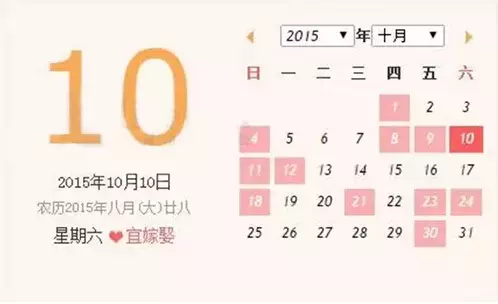 2015年10月10日 农历08月(大)28日 星期六 冲牛(癸丑)煞西
