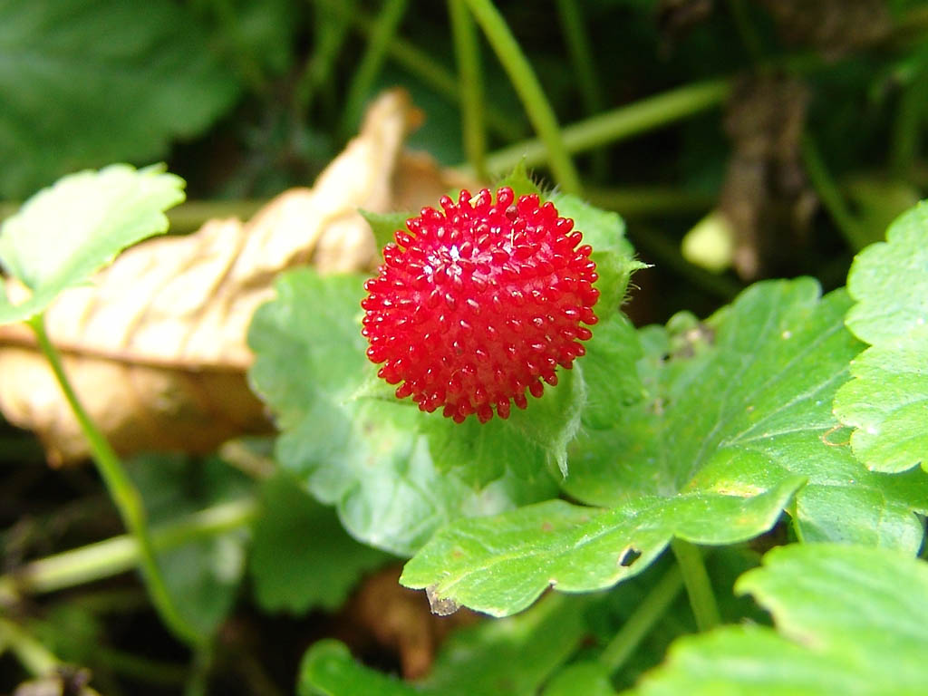 注意蛇莓肉质的是花托,上面的一个一个小点是果实。这个类似于草莓,但和其他悬钩子属的“莓”类不同。