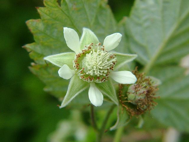 蓬蘲是一种蔷薇科植物,呈匍匐状贴地生长,高度一般不超过膝盖,开白色小花,藤蔓上长有刺。”辨别蓬蘲最简单的方法就是看摘下来是不是空心的,其他莓子采摘的时候一般可以连果带蒂一起摘下来,蓬蘲摘下来是不带蒂,空心的,个头相对较圆。
