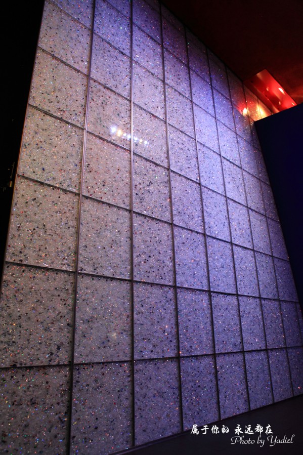沿着水晶墙便可进入到水晶世界内部。转入第一个展馆水晶行星(PlanetofCrystals),只见黑漆漆的天幕中布满璀璨夺目的水晶,这是一组三维投影和建筑构件的精巧结合