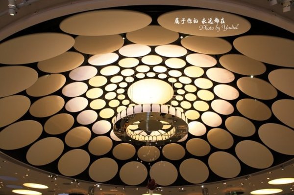 【P3】大厅的装饰也是极具特色,吊顶用一圈一圈从大到小的圆饼型水晶装饰而成,看着就像一个巨大的莲蓬。
