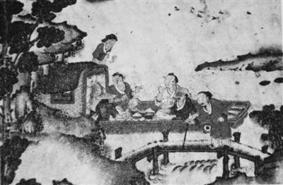 船在“溪涧野炊”一幕中也有出现。在这个画面中,一叶扁舟横于水面,四名男子正在舱前举杯畅饮,一名妇女在舱后持壶侍酒,船前的小桥上,一名男子手持竹杖静静独立,仿佛是在张望青葱的远山,又好像是在为船上的一幕会心而笑。