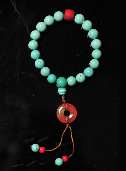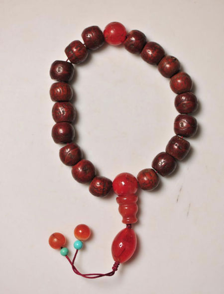 文康的《儿女英雄传》第十五回形容邓九公新娶的姨奶奶好一番打扮,道是“胸坎儿上带着一挂茄楠香的十八罗汉香珠儿,又是一挂早桂香的香牌子,又是一挂紫金锭的葫芦儿,又是一挂肉桂香的手串儿,又是一个苏绣的香荷包,又是一挂川椒香荔枝,余外还用线络子络着一瓶儿东洋玫瑰油。这都是邓九公走遍各省给她带来的,这里头还加杂着一副镂金三色儿一面檀香怀镜儿,都交代在那一个二纽上”。这里特别用了揶揄的口吻自不必说,一应琐碎却描写得真切,“都交代在那一个二纽上”,大襟的第二颗纽扣上挂手串,晚清图像上也有不少例子,如慈禧太后的许多写真画像上便有这种情形,据传闻,当时清宫造办处下设的42个工坊,就有不少是为了打造老佛爷的专属饰品而特别设立的。