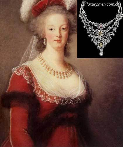 1. 玛丽-安托瓦妮特的项链价值:3700万美元在名单里排名第一的,同时也是最昂贵的这串项链属于玛丽-安托瓦妮特(Marie Antoinette),她是奥地利皇帝弗朗西斯一世和王后Maria Theresa的第十五个孩子。这串耀眼的项链由无数的白色钻石以及两粒十分罕见的椭圆形黄钻(重为5.24克拉)镶嵌而成,在项链最上方则坠着一颗美妙绝伦的粉钻,所有钻石都被完美地镶嵌在白金底座中,总重量为8.05克拉。另外,项链底端还有一颗白色的梨形钻石如水滴般垂下,重量为7.06克拉。