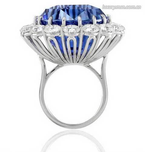 7.英国王室的蓝宝石戒指椭圆形的蓝宝石宛如一汪深不可测的蓝湖,周围镶嵌着的无数碎钻使整个戒指看上去璀璨夺目,溢彩流光,绝对是目前世界上最昂贵的钻石戒指之一。