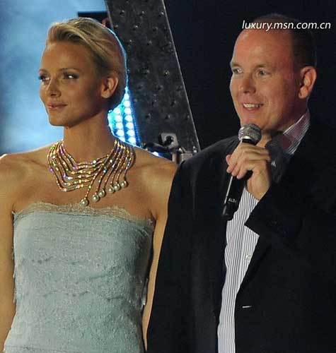 6.摩纳哥亲王妃的“无边瀑布”项链 嫁给了摩纳哥亲王Albert后,Charlene Wittstock拥有了“亲王妃”这个王室头衔,同时也成为了摩纳哥王室里那些美艳耀眼的首饰们的女主人。