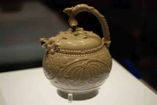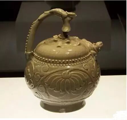 青釉提梁倒注瓷壶,高18.3厘米,腹径14.3厘米。1968年出土于陕西彬县。伏凤式提梁,以花蒂意味壶盖。盖、壶衔接处堆塑哺乳母子狮,母狮张口为流。球形壶腹刻饰缠枝牡丹。底部两头有梅花形灌水孔,外型奇巧,是耀窑瓷器佼佼不群的绝世珍品。
