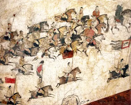 佃猎出行图,高100-200厘米,全长890厘米。1971年陕西乾县李贤墓出土。原图揭取时分为数幅,画面以青山松林为背景,四十多个骑马佃猎者携弓带箭或持旗或持驯豹鞭,簇拥着主人纵马驰向猎场,殿后的还有两匹负重骆驼,构图气势磅礴,宏伟壮不雅观。是唐墓壁画中上乘精品。