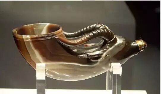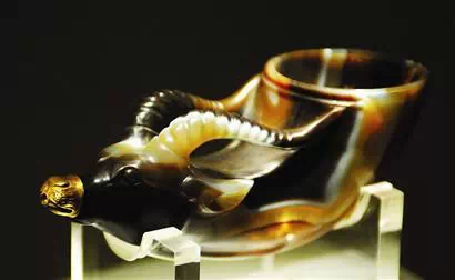 镶金兽首玛瑙杯,唐代饮器,国之重宝,长15.5厘米,口径5.9厘米。1970年西安市南郊何家村出土,是中国首批禁止出国(境)展览文物,更是陕西历史博物馆镇馆之宝。玛瑙杯选材优秀,巧妙使用玉料的俏色纹理砥砺而成。杯体为角状兽首形,兽双角为杯柄。嘴部镶金帽,眼、耳、鼻皆刻划纤细精确。从选材、设计到工艺,都可称为唐代玉雕艺术的精品,是至今所见的唐代独逐个件俏色玉雕,是唐代玉器做工最精湛的一件,也是唐代中外文明交流的产物。
