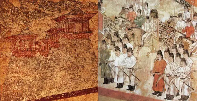 阙楼仪仗图,均高296-420厘米,宽976-928厘米。1971年陕西乾县懿德太子墓出土。懿德太子李重润是唐中宗李显的长子,高宗李治与武则天的孙子。大足元年(701年)遭忠言被武则天杖杀,时年19岁,中宗复位后,于神龙二年(706年),以太子身份陪葬乾陵并号墓为陵。