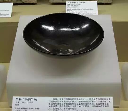 黑釉油滴碗,高8.5厘米,口径30厘米,底径10.6厘米。出土于陕西渭南。碗大口小足,胎质灰白,通体施黑釉。油层表面布满了大小不一,称金属光泽的小圆点,这些圆点就像浮在水面上的油滴一样,因此被称为“油滴釉”,非常美丽。油滴釉是黒釉中一个特殊的种类,属于结晶釉。这件是迄今所见同类器物中体量最大的一件,可谓瓷中瑰宝。
